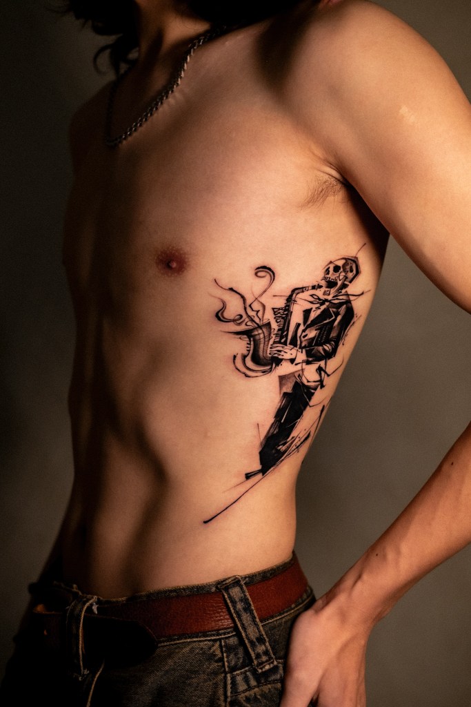 The skull is inspired by Jack from The Nightmare Before Christmas, a character the client’s mother loves.